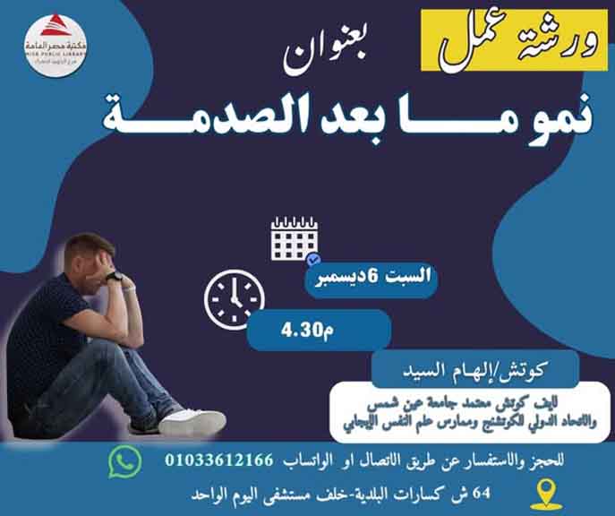 في إطار اهتمام مكتبة مصر العامة بالزاوية الحمراء بتقديم الدعم النفسي للمجتمع، تنظم المكتبة ورشة مجانية بعنوان “نمو ما بعد الصدمة” يوم السبت 6 ديسمبر الساعة 4:30 مساءً، وذلك بالتعاون مع الكوتش إلهام السيد، الممارس المعتمد في علم النفس الإيجابي من جامعة عين شمس والاتحاد الدولي للكوتشينج.