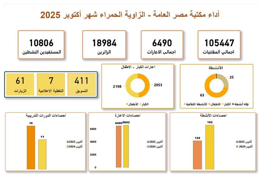 تعكس مؤشرات الأداء في مكتبات مصر العامة خلال شهر أكتوبر 2025 التزامها بنشر الثقافة والمعرفة ودعم مبادرات التعلم مدى الحياة، بما يتماشى مع توجه الدولة نحو تعزيز الوعي المجتمعي والارتقاء بمستوى الخدمات الثقافية المقدمة للمواطنين في مختلف مناطق القاهرة.